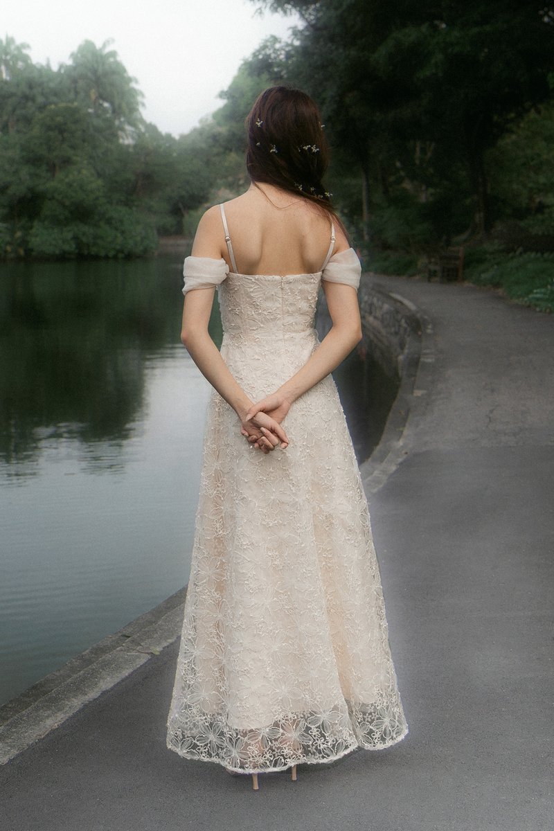 NOTE: Due to the delicate nature of embellished tulle fabrics, extra care should be taken when trying the dress. One should refrain from wearing it with accessories (e.g. jewellery or hand bags with sharp / metal edges) where the fabric can be easily hooked on.