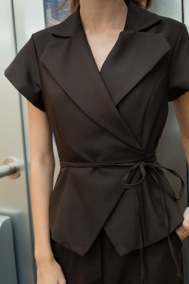 A wrap top crafted with blazer-quality construction for a structured, polished fit. Featuring notched lapels and subtle shoulder pads to define the silhouette, it blends the sophistication of a blazer with the ease of a wrap style. Effortlessly chic, a modern piece that moves seamlessly from desk to dinner.