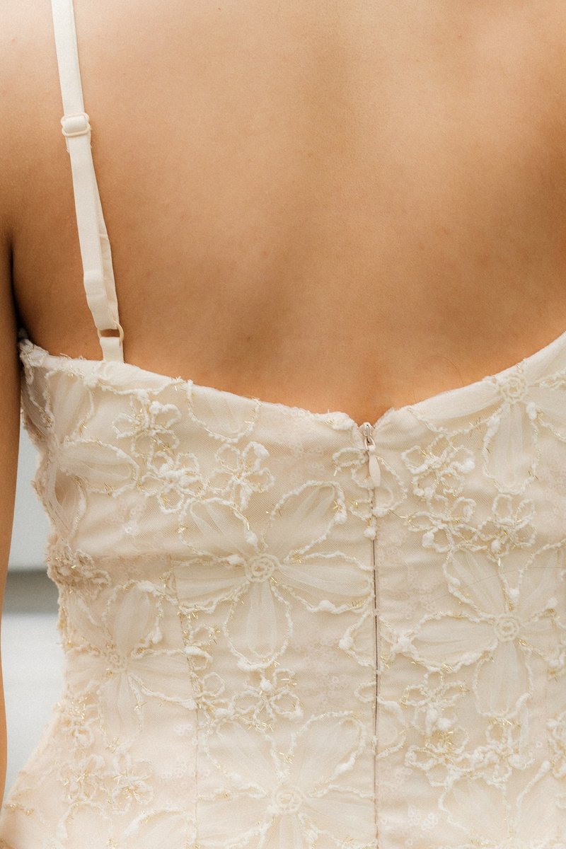 NOTE: Due to the delicate nature of embellished tulle fabrics, extra care should be taken when trying the dress. One should refrain from wearing it with accessories (e.g. jewellery or hand bags with sharp / metal edges) where the fabric can be easily hooked on.